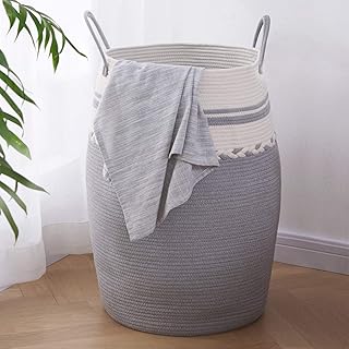 Jorasa 収納バスケット 大型 ロープバスケット ランドリーバスケット おもちゃ収納 コットンロープ 多用途 整理 ランドリー バスケット 折りたたみ 丸洗い可能 毛布収納 綿織バスケット おもちゃ入れ 収納 かご (ホワイト グレー、55Lx55Dx35H cm)