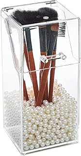 ColorfylCoco(カラフィルココ) コスメ収納 メイクブラシホルダー ふた付き メイクブラシ スタンド メイクブラシケース 収納ボックス パールストーン付き メイクボックス アクリルケース 透明 化粧品 卓上 収納ケース 化粧ブラシ ホルダー (クリアー×ホワイト)