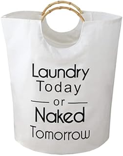 Ali Vezas 22インチ 大型 折りたたみ可能 洗濯バスケット バッグ 100%生地 PE防水レイヤー 天然竹ハンドル 60L 洗濯かご キャンバス収納バスケット 寝室用 ホワイト
