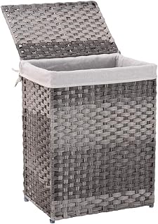 Mxfurhawa 手織り 洗濯バスケット 折りたたみ式 ラタン 洗濯かご 取り外し可能な洗濯可能なライナーバッグ 蓋とハンドル付き ポータブル長方形洗濯かご バスルーム 寝室 バルコニー用 (グレー)