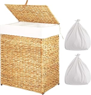 Greenstell 手織り ウォーターヒヤシンス 洗濯かご 取り外し可能なライナーバッグ2個付き 洗濯バスケット 蓋とハンドル付き 折りたたみ式 簡単取り付け ナチュラルサイズ