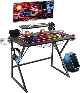 【Amazon限定ブランド】パソコンデスク pcデスク 幅100cm×奥行60cm モニター台付きワークデスク ゲーマーに向け LED照明付きキーボードパッド付きゲーミングデスク 机 在宅勤務 K字 頑丈で組立簡単勉強机 複数のストレージ 耐荷重80KG ブラック