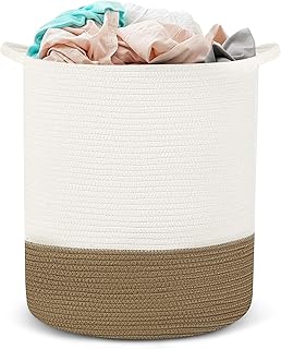 HYNAWIN コットンロープストレージバスケット ランドリーバスケット 装飾編みバスケット 洗濯物用 20インチ x 13インチ (ブラウンとオフホワイト) Tall (18''*16'')